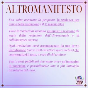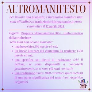 L’Altrosessuale è lietə di annunciare la call for translations per il mese del Pride 2024, quest’anno dedicata alla traduzione in italiano di manifesti e scritti politici relativi alla comunità LGBTQIA+. Le scadenze sono: